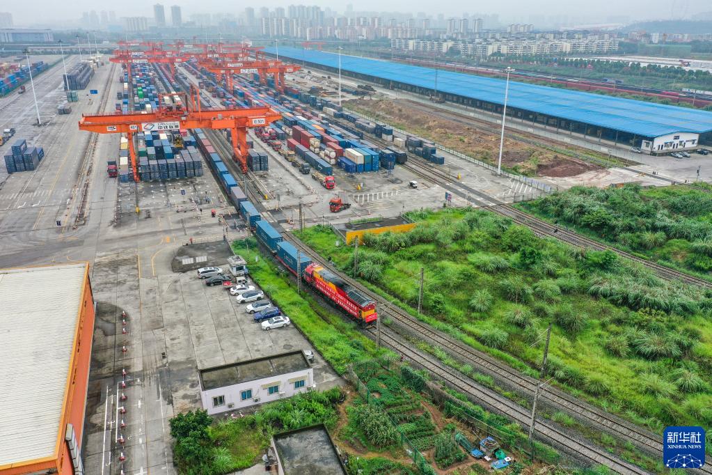 滿載著電子產(chǎn)品、機械零件、日用百貨等貨物的中歐班列(重慶)第10000列列車從重慶團結(jié)村中心站駛出(2022年6月23日攝,無人機照片)。新華社記者 黃偉 攝