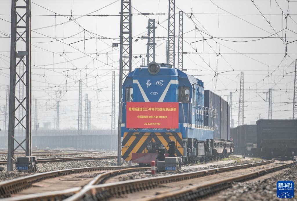 陸海新通道長江-中南半島國際聯(lián)運班列(中國果園港-老撾萬象-緬甸仰光)從重慶果園港發(fā)出(2022年4月7日攝)。新華社記者 黃偉 攝