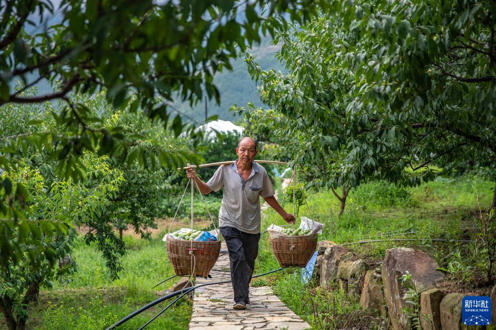 在巫山縣曲尺鄉(xiāng)柑園村,村民張興前在挑運脆李(2022年7月2日攝)。新華社記者 黃偉 攝