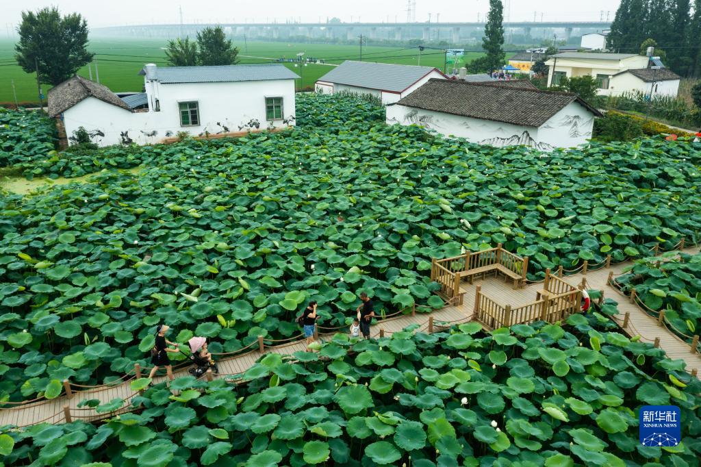 人們?cè)谒拇ㄊ∶忌绞袞|坡區(qū)太和鎮(zhèn)永豐村欣賞荷塘美景,荷塘旁邊就是村里處理生活污水所用的埋于地下的污水收集池、沉渣池、四級(jí)厭氧池等(2022年6月22日攝)。新華社記者 沈伯韓 攝