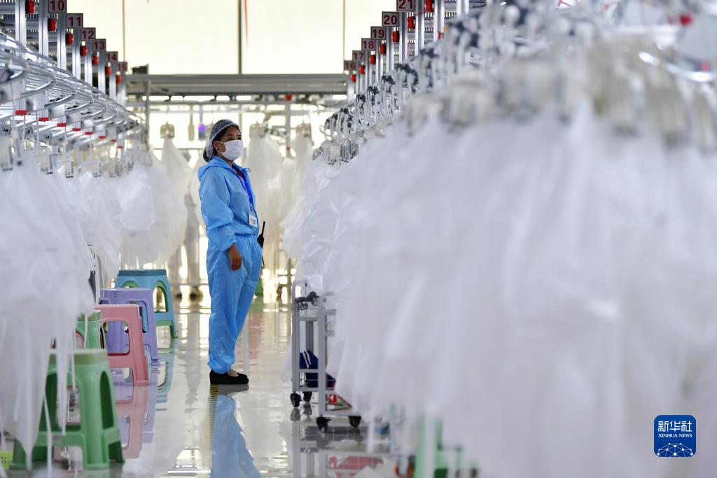 在甘肅省臨夏回族自治州積石山保安族東鄉(xiāng)族撒拉族自治縣,依托東西部扶貧協(xié)作平臺(tái)引進(jìn)的服裝加工企業(yè)甘肅拓奇扶貧車間的員工在服裝加工生產(chǎn)線上作業(yè)(2020年8月9日攝)。新華社記者 陳斌 攝