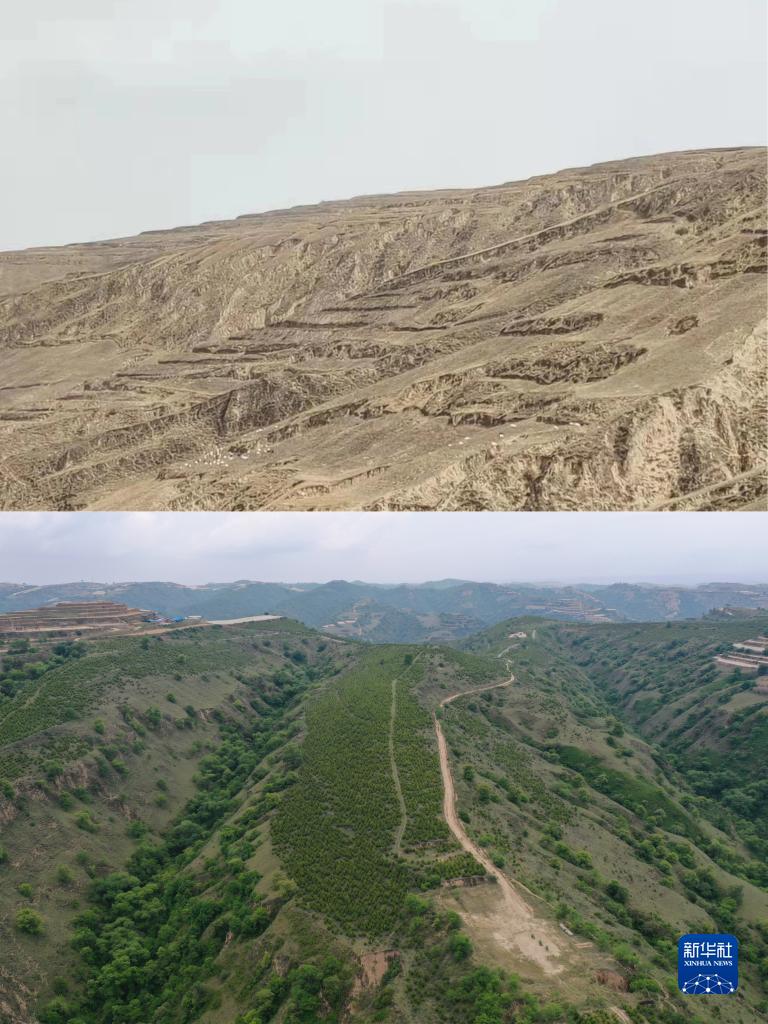 拼版照片:上圖為2013年拍攝的甘肅省慶陽市華池縣南梁鎮(zhèn)高臺(tái)村荒山景象(資料圖片,華池縣自然資源局供圖);下圖為2022年5月25日拍攝的甘肅省慶陽市華池縣南梁鎮(zhèn)高臺(tái)村萬畝苗林示范點(diǎn)景象(無人機(jī)照片,新華社記者杜哲宇攝)。新華社發(fā)