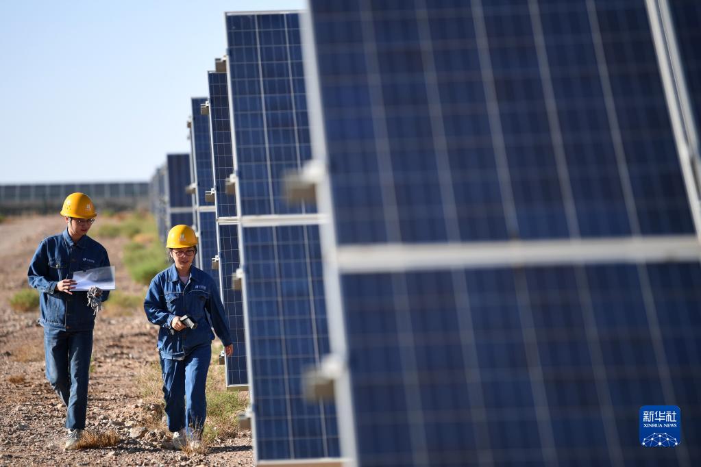 2022年6月13日,光伏電站工作人員李靜(右)和同事在甘肅省金昌市華能集團(tuán)西坡光伏電站現(xiàn)場(chǎng)巡檢。新華社記者 陳斌 攝