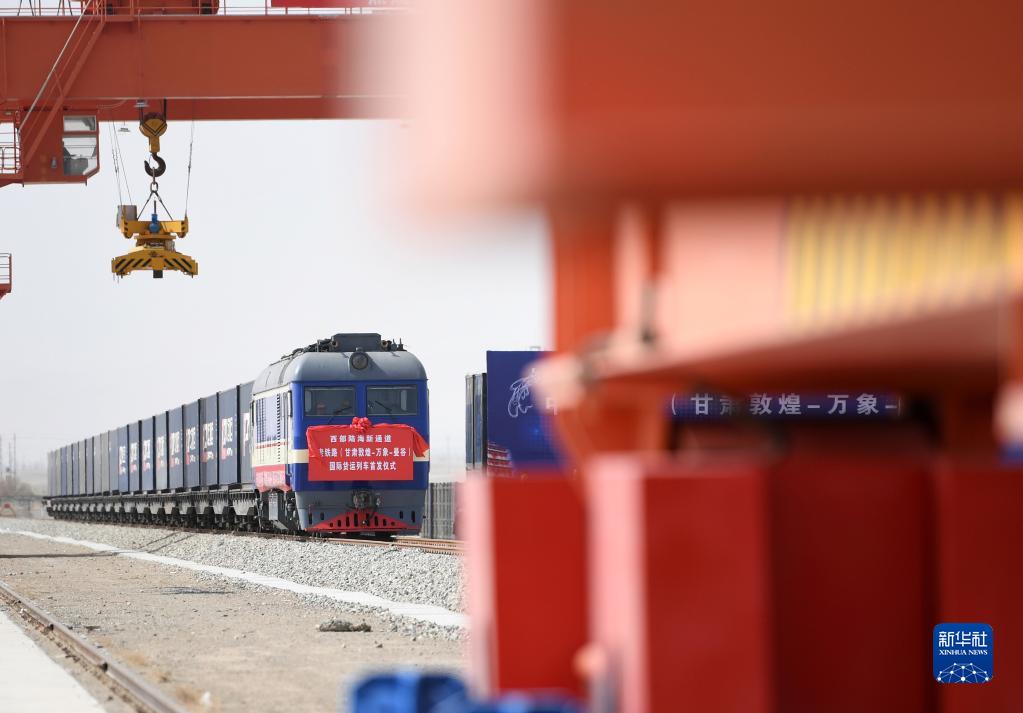 2022年4月21日,甘肅首趟中老鐵路國(guó)際貨運(yùn)列車在敦煌市鐵路西貨站綜合貨場(chǎng)等待發(fā)車。新華社記者 陳斌 攝
