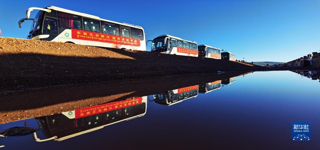 在西藏那曲市雙湖縣多瑪鄉(xiāng)拍攝的整裝待發(fā)的車隊,客車載著牧民前往位于山南市貢嘎縣的森布日安置點(2022年7月19日攝)。新華社記者 沈虹冰 攝