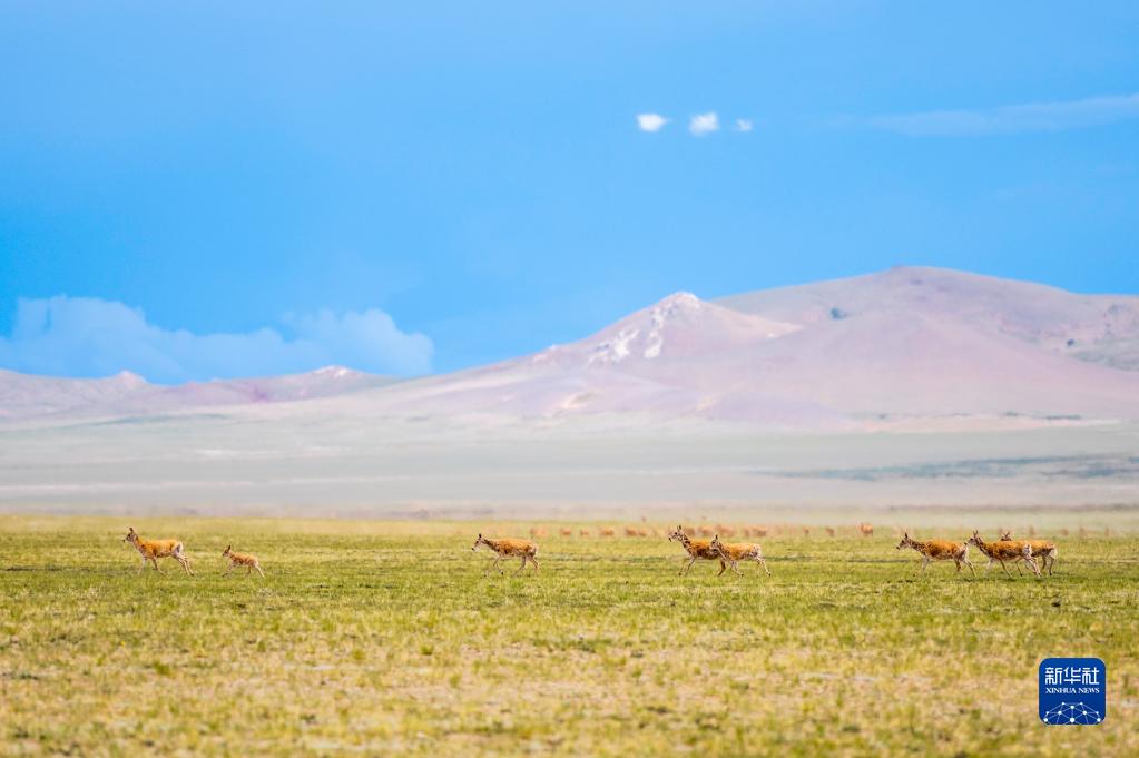 在西藏自治區(qū)北部的羌塘國家級自然保護區(qū),藏羚羊在草原上奔跑(2022年7月11日攝)。新華社記者 周荻瀟 攝