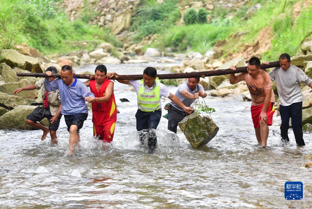 在位于黔桂交界大苗山深處的烏英苗寨,駐村第一書記韋桂華(右四)、黨員梁成兵(右三)、梁志新(左二)帶領(lǐng)村民維修河堤(2019年6月30日攝)。新華社記者 黃孝邦 攝