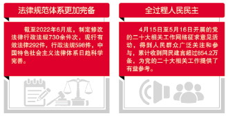 十年來,法律規(guī)范體系更加完備。加快建設(shè)中國特色社會(huì)主義法治體系,全面加強(qiáng)憲法實(shí)施和監(jiān)督,編纂民法典,制定香港特別行政區(qū)維護(hù)國家安全法,修改完善香港選舉制度,截至2022年6月底,制定修改法律行政法規(guī)730余件次,現(xiàn)行有效法律292件,行政法規(guī)598件,中國特色社會(huì)主義法律體系日趨科學(xué)完善。