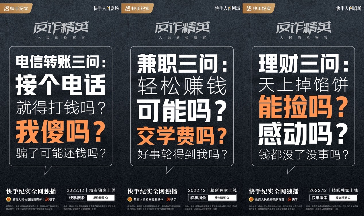 單親媽媽為何深陷“殺豬盤”執(zhí)迷不悟?什么樣的項目專騙老年人還屢屢得手?詐騙分子如何一人分飾多角?現(xiàn)實中,電信網(wǎng)絡(luò)詐騙犯罪愈演愈烈,亟需人們提高警惕。近日,反電信網(wǎng)絡(luò)詐騙法正式施行。由最高人民檢察院新聞辦公室、第四檢察廳及檢察日報社指導,最高人民檢察院新媒體、快手及正義傳媒聯(lián)合出品的反詐主題紀實短劇《反詐精英——人民的檢察官》(以下簡稱“《反詐精英》”)于2022年12月10日在快手獨家上線,@最高人民檢察院 @正義網(wǎng) 兩大快手賬號首發(fā)。《反詐精英》從奮戰(zhàn)在辦案一線的人民檢察官視角出發(fā),以富有戲劇張力的紀實短劇形式講述真實反詐故事,創(chuàng)新呈現(xiàn)專業(yè)普法內(nèi)容。
